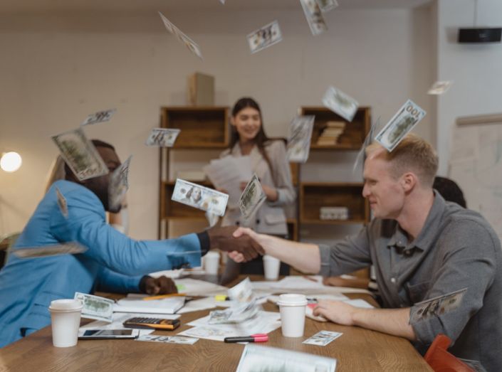 Money flying around in a room